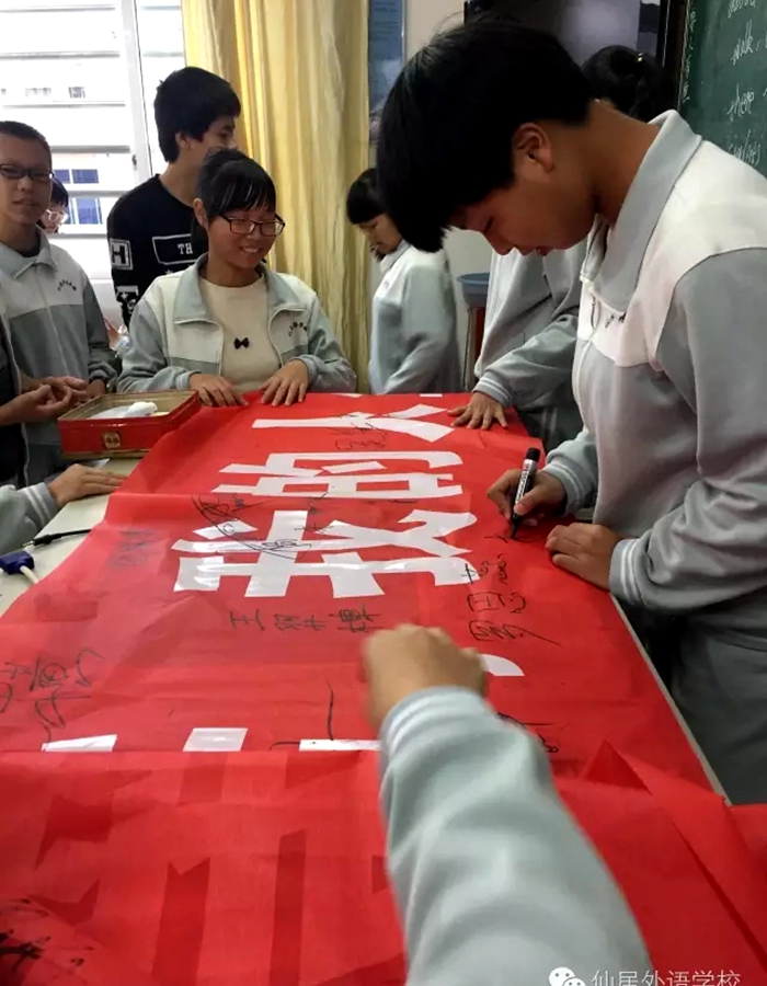 現(xiàn)場還舉辦了“珍愛生命,熱愛生活,我的人生我做主”橫幅簽名活動。陳震宇首先簽名,各班級學(xué)生在本班橫幅上分別簽名。
