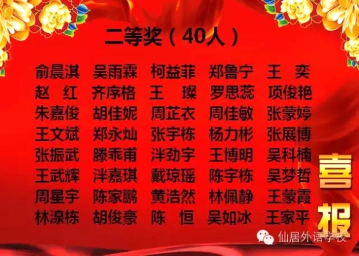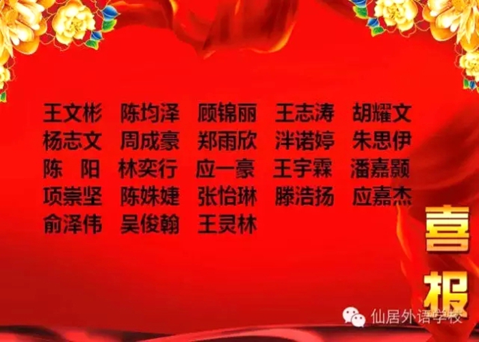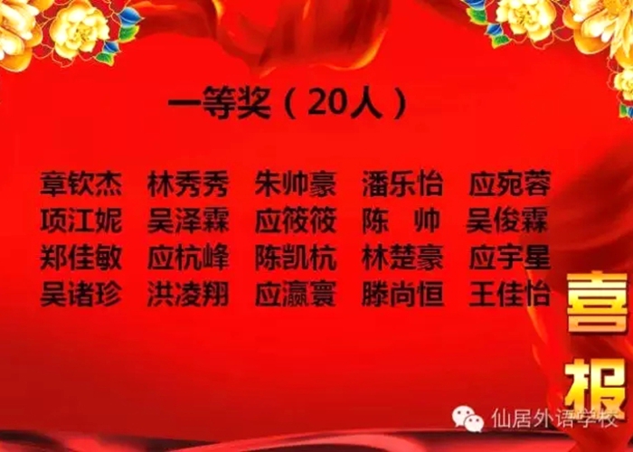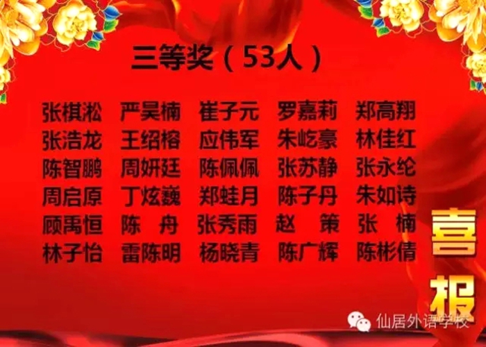 仙居外語學(xué)校初二年級(jí)在縣四科聯(lián)考中喜獲佳績,一等獎(jiǎng)20人(全縣50人),二等獎(jiǎng)40人(全縣100人),三等獎(jiǎng)53人(全縣170人)。我校124人參賽,113人獲獎(jiǎng),獲獎(jiǎng)率高達(dá)91.13%,占全縣獲獎(jiǎng)總?cè)藬?shù)的三分之一多。