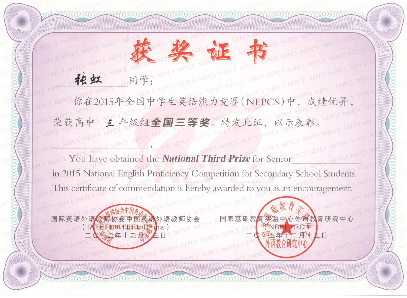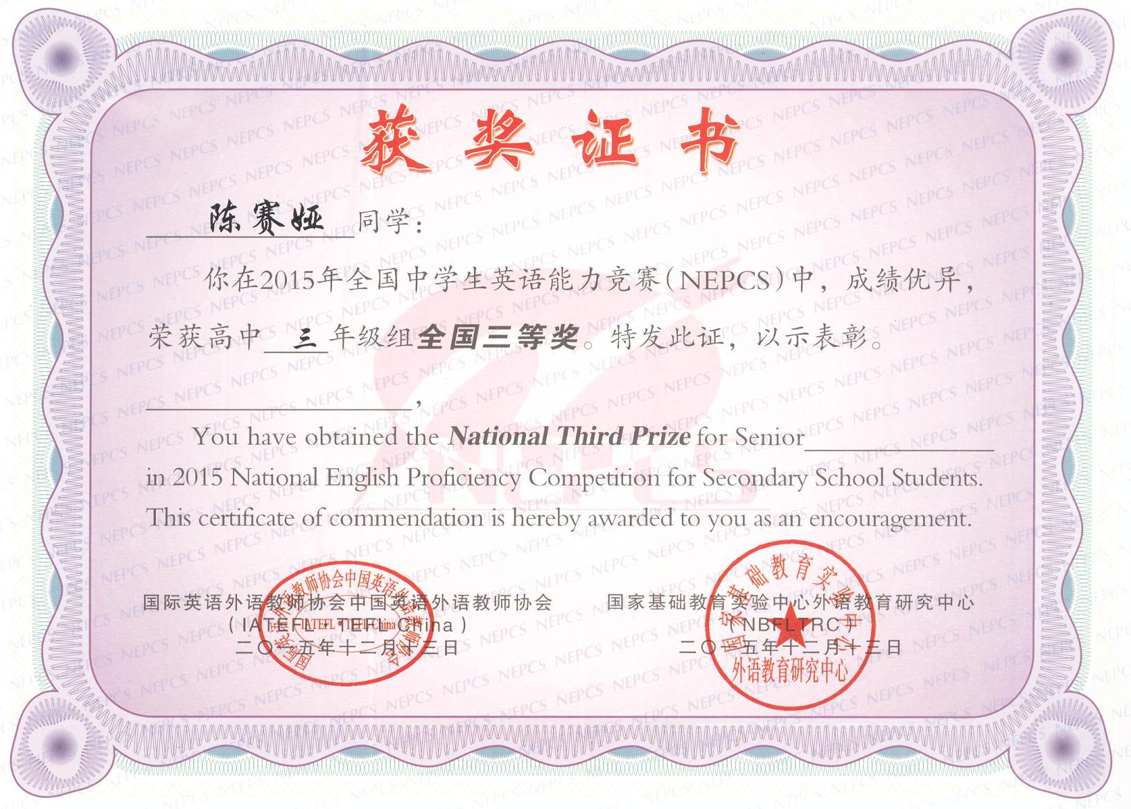 2015年全國中學生英語能力競賽(NEPCS)捷報