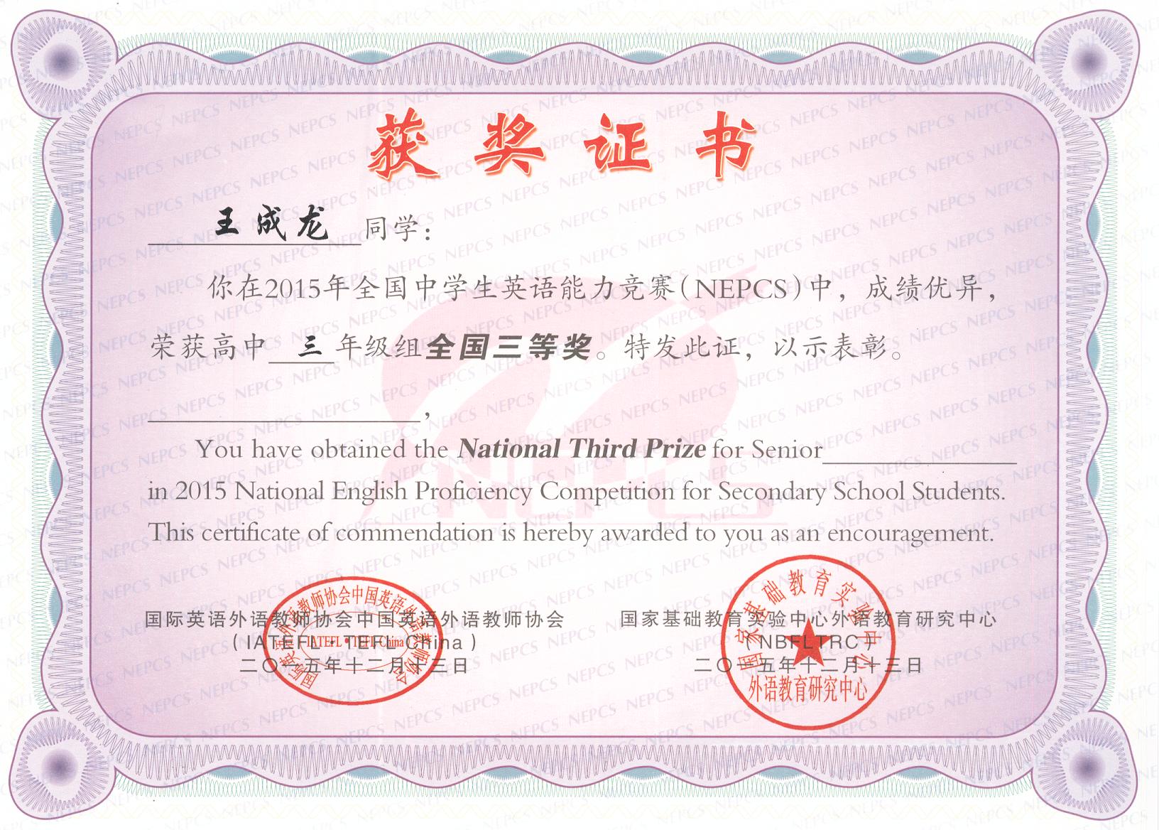 王成龍同學 全國三等獎