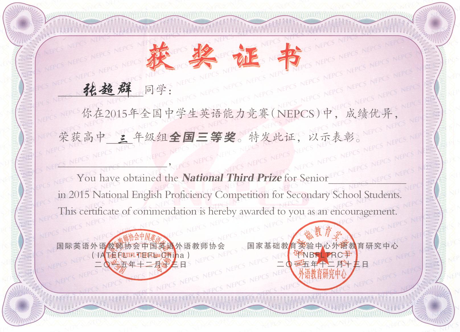 張超群同學 全國三等獎