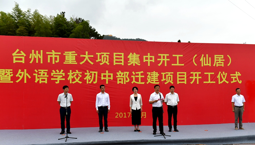 開工儀式上,仙居外語學(xué)校書記周升豪介紹了遷建工程項目概況;縣教育局副局長朱憶貧代表教育局表態(tài),為確保優(yōu)質(zhì)工程,將狠抓進度,加強溝通與協(xié)調(diào),強化安全施工檢查;安洲街道黨委書記楊含呈表態(tài),將以最快速度、最優(yōu)服務(wù)、最嚴紀律配合業(yè)主和施工單位,加快工程進度;縣委常委、常務(wù)副縣長鄭旭東做動員講話,鄭縣長指出今天的重大項目開工是臺州市“大抓項目,抓大項目”活動的一部分,縣委將緊緊圍繞市、縣的決策部署,以“大抓項目年”為抓手,進一步拉高標(biāo)桿,搶抓機遇,優(yōu)化投資環(huán)境,推進重點項目建設(shè),真正把仙居外語學(xué)校初中部遷建項目建設(shè)成為高標(biāo)準、超一流的樣板工程;最后縣委書記林虹宣布項目開工。