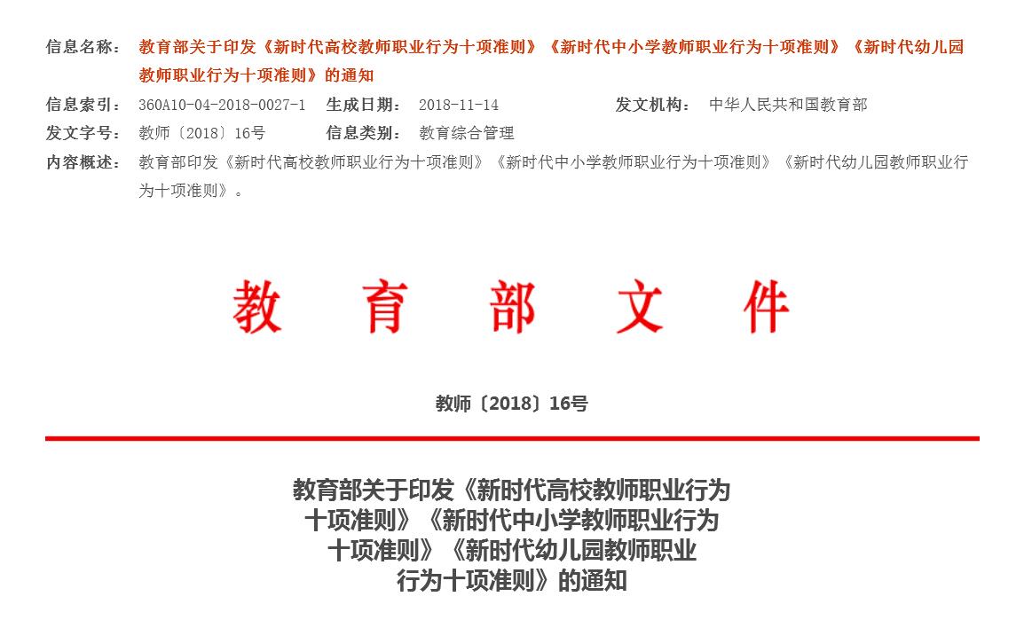 原標(biāo)題:教育部關(guān)于印發(fā)《新時代高校教師職業(yè)行為十項準(zhǔn)則》《新時代中小學(xué)教師職業(yè)行為十項準(zhǔn)則》《新時代幼兒園教師職業(yè)行為十項準(zhǔn)則》的通知