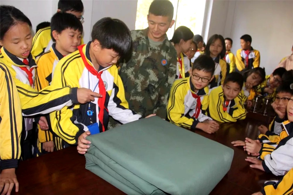 最后,我們還參觀了消防員叔叔們的宿舍,他們?yōu)槲覀冋故玖?ldquo;豆腐被”的疊法,方方正正的被子讓我們住校班的同學躍躍欲試,迫不及待的上手疊了起來,還別說,還真有點樣子呢!