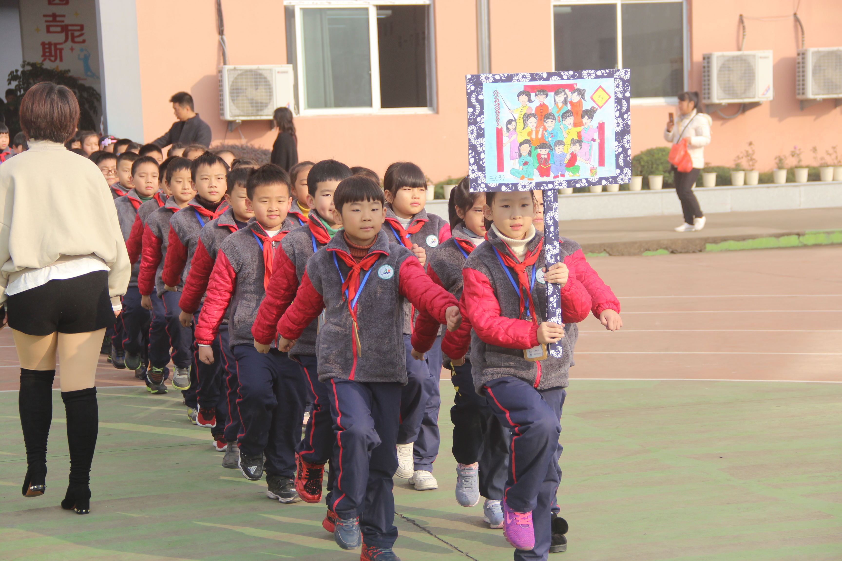 上午九點(diǎn)整,各班的孩子們排著長長的隊伍,聽著熟悉的音樂,邁著整齊而又有力的步伐進(jìn)入操場,只見每班的排頭學(xué)生都拿著班級的手繪全家福,有的竟然把班級里的每個同學(xué)都畫出來了,小細(xì)節(jié)都體現(xiàn)出了同學(xué)們的個人特色,真是用心;還有的圍在一起讀書、唱歌、跳舞,學(xué)校里的日常畫面被孩子們認(rèn)真地畫到了畫紙上,可真是一個個溫馨的班級呀。