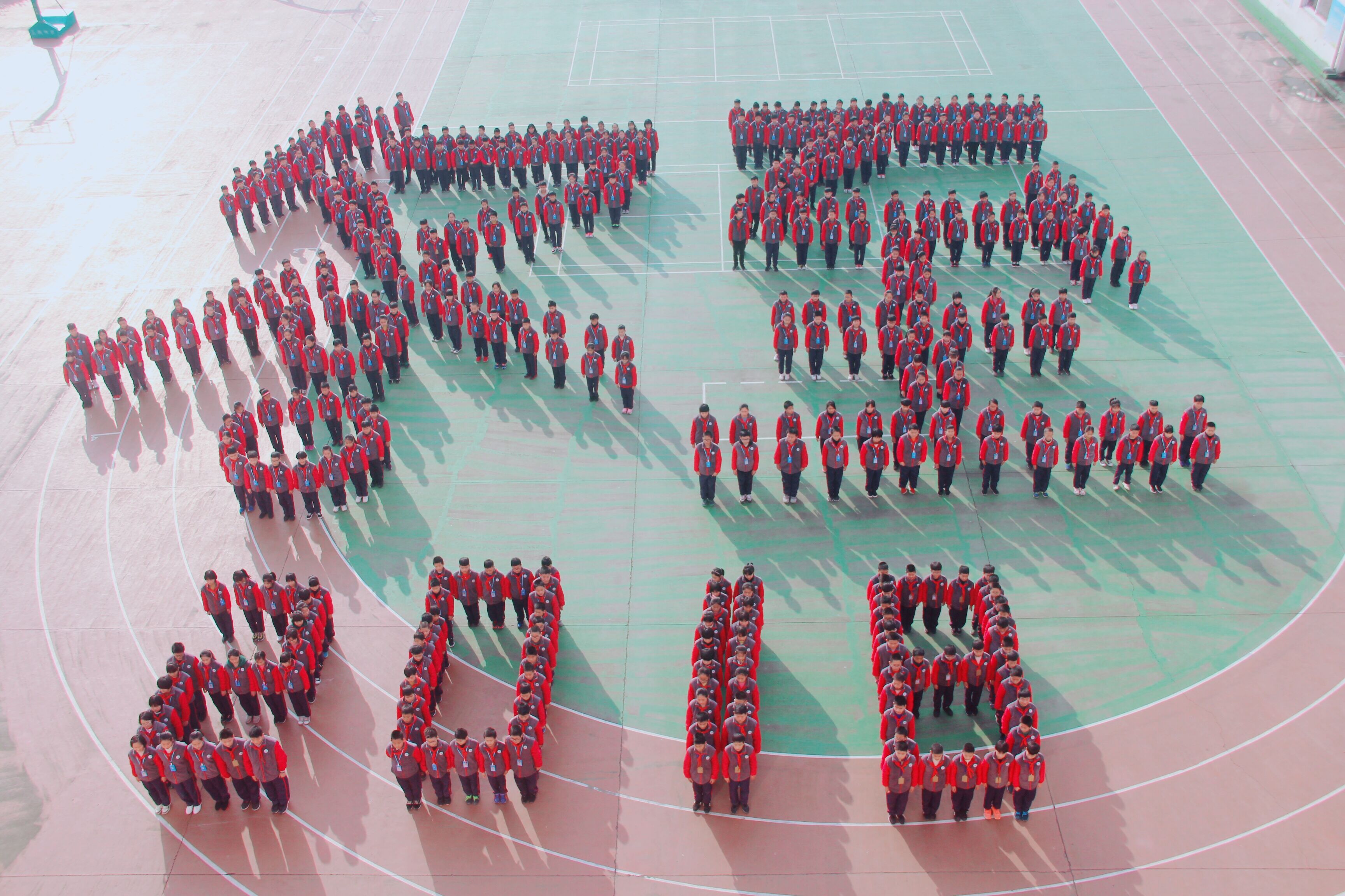 最后,退場了。沒想到更大的驚喜出現(xiàn)了,只見六年級同學(xué)慢慢向操場移動,很快就擺出了“冬至”字樣,五2五3的同學(xué)們魚貫而出,與六年級同學(xué)匯合,“冬至2018”很快出現(xiàn)在眼前,令人驚嘆!
