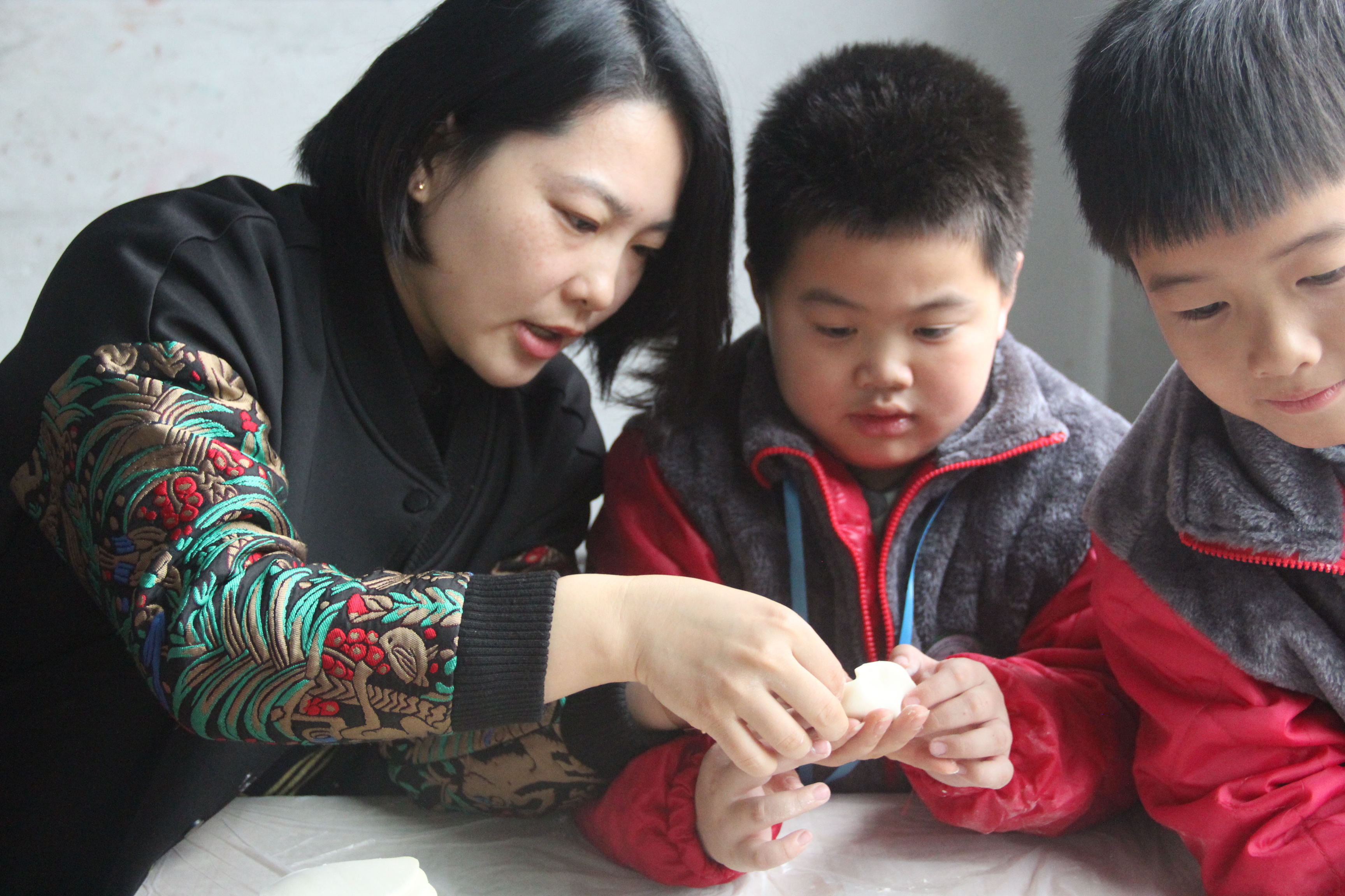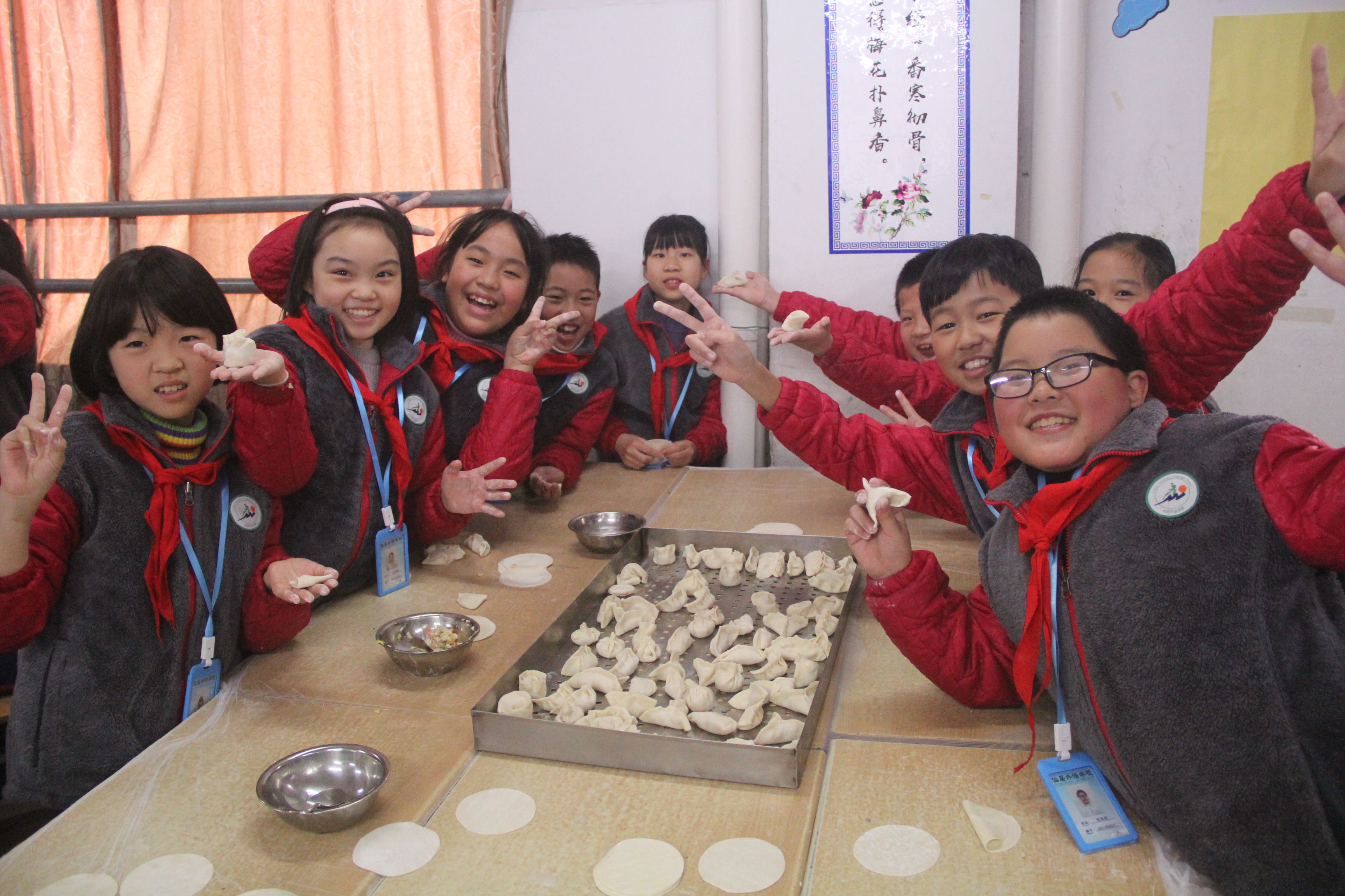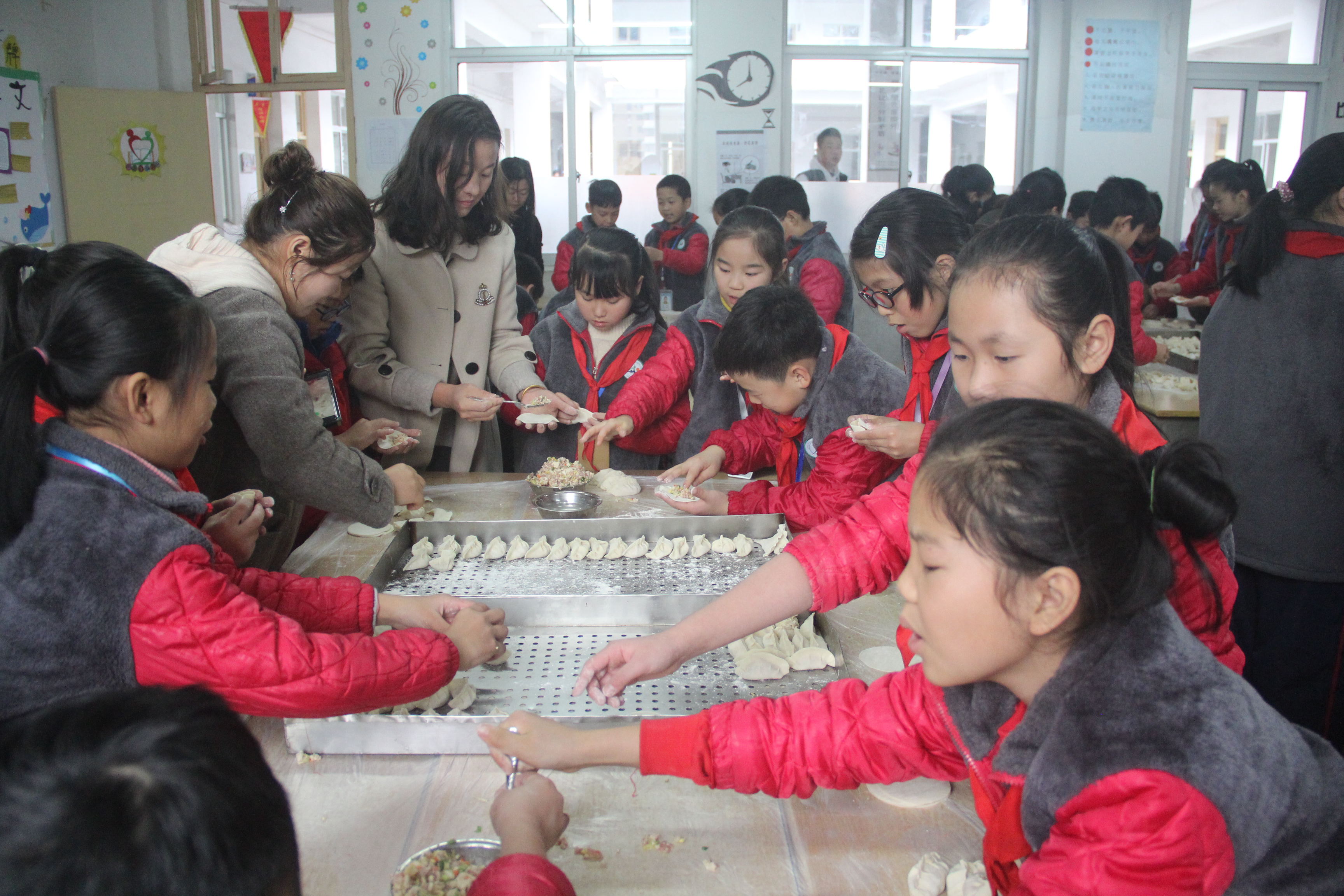 結(jié)束了操場的活動,馬上就要開始包餃子了。包餃子前當(dāng)然要先把小手洗干凈,只見每個班的孩子都熟練的從后門出來,排成一支隊伍向廁所前進(jìn),洗完手的出來也排成隊從班級前門進(jìn),兩排隊伍從高處看就像兩條長龍,沒有推擠只有禮貌的插空,沒有吵鬧只有有序的行走,這樣的洗手既解決了廁所洗手擁擠問題,又很好地保障了孩子們的安全,避免了碰撞。洗完手,香噴噴的餃子餡兒已經(jīng)在教室里等著大家了,老師們與家長們加入到孩子們的中間,耐心地傳授包餃子秘訣。高年級的孩子本身就有不少包餃子的經(jīng)驗(yàn),再加上一指點(diǎn),餃子各個都像圓滾滾的胖娃娃。低年級的孩子們太興奮啦,各種奇形怪狀的餃子出爐,有像包子的,有像花朵的,還有做成小貓小狗的,雖然包的不怎么樣,還有“漏肚皮”的,但是和同學(xué)一起包餃子,這個有趣的過程就足以代替一切了……