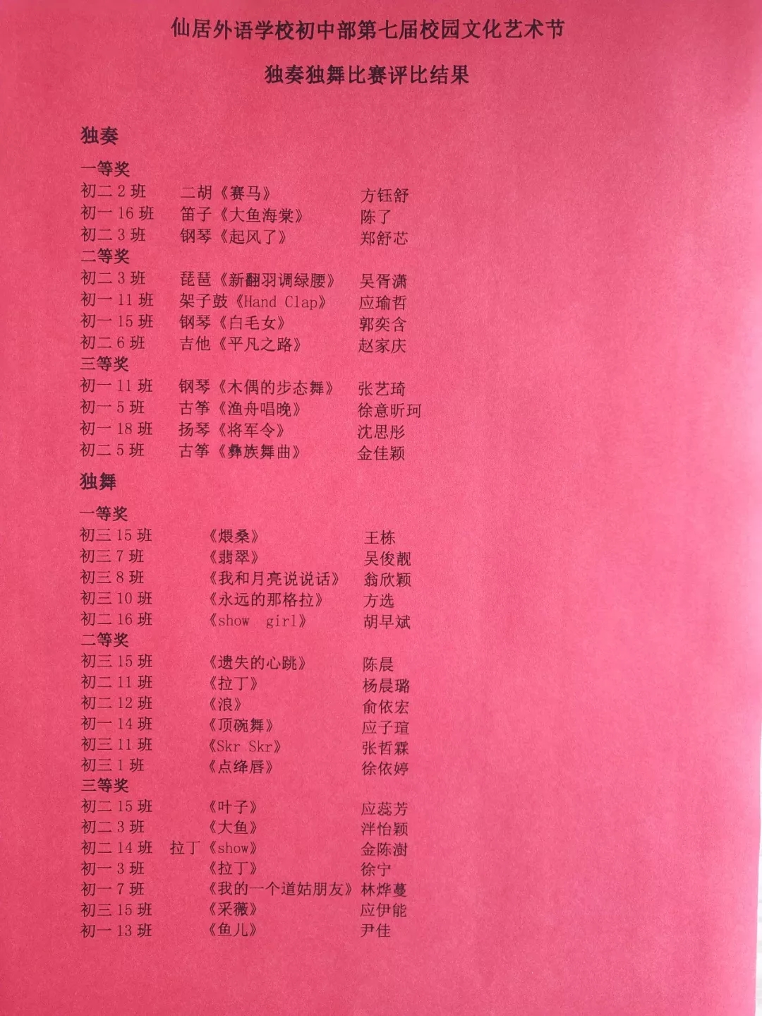 附:仙居外語學(xué)校初中部第七屆校園文化藝術(shù)節(jié)“獨奏獨舞”比賽評比結(jié)果
