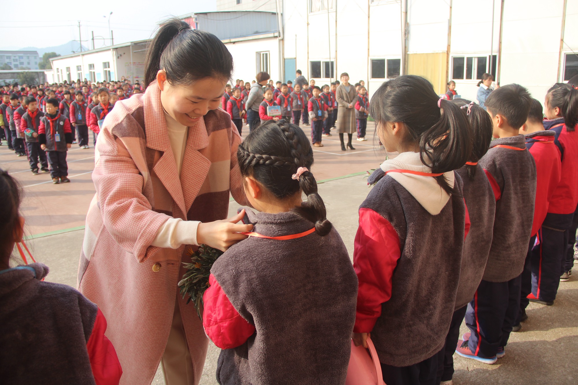 徐老師向全校同學(xué)介紹了護(hù)花小匠們,柯老師和吳老師還為他們戴上了工作證。