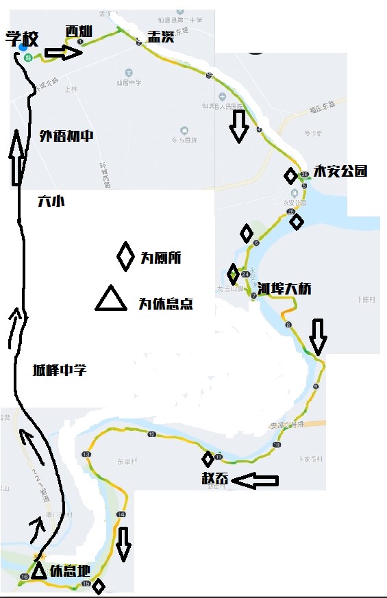 學(xué)校東大門出發(fā)→西燦村→盂溪→永安公園→綠道→河埠大橋→管山加油站右轉(zhuǎn)→新綠道→原趙岙農(nóng)莊→清口園大橋→清口園大橋下溪灘休息→清口園村→(不過隧道)223省道→石板路→三橋(六?。?rarr;溪濱北路→外語初中部西大門邊路→杜婆人家→南大門回到學(xué)校。