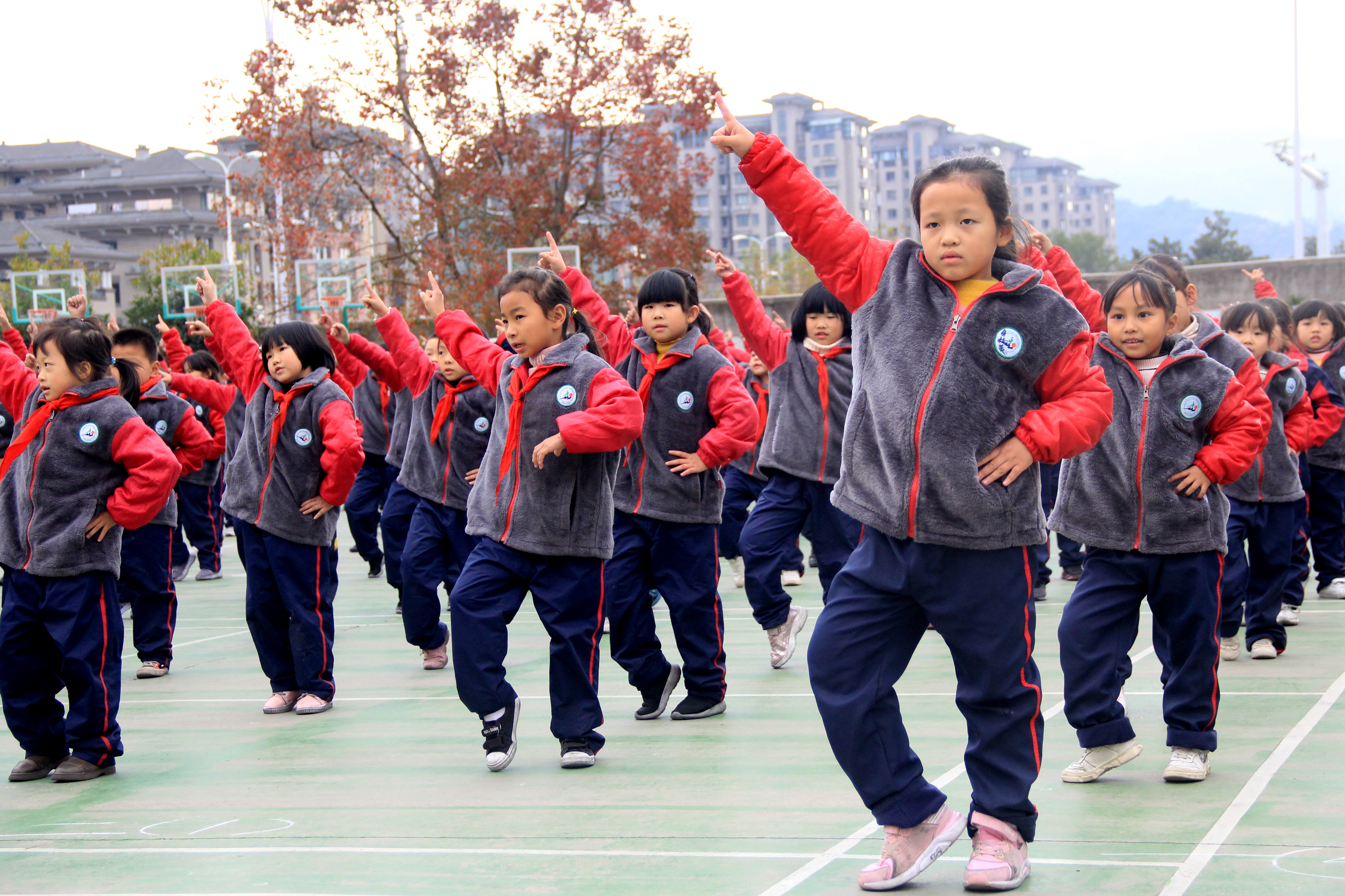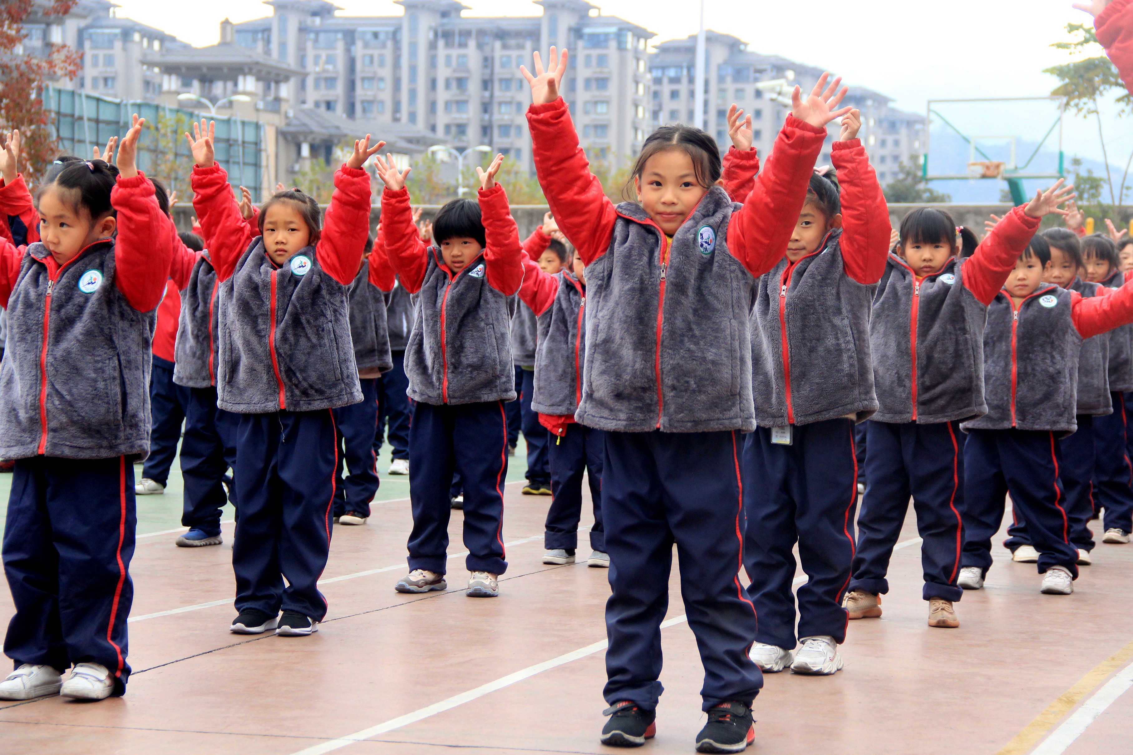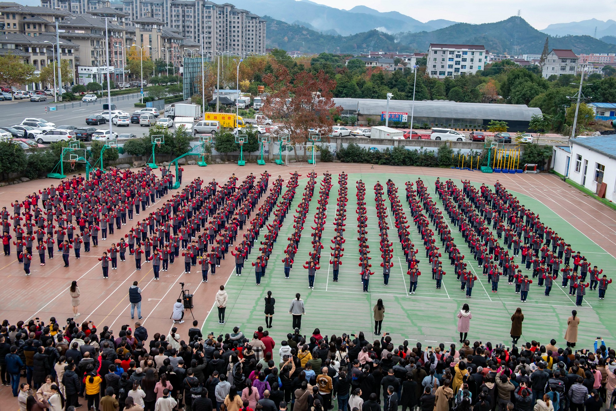 家長(zhǎng)會(huì)現(xiàn)場(chǎng),孩子們表演健美操