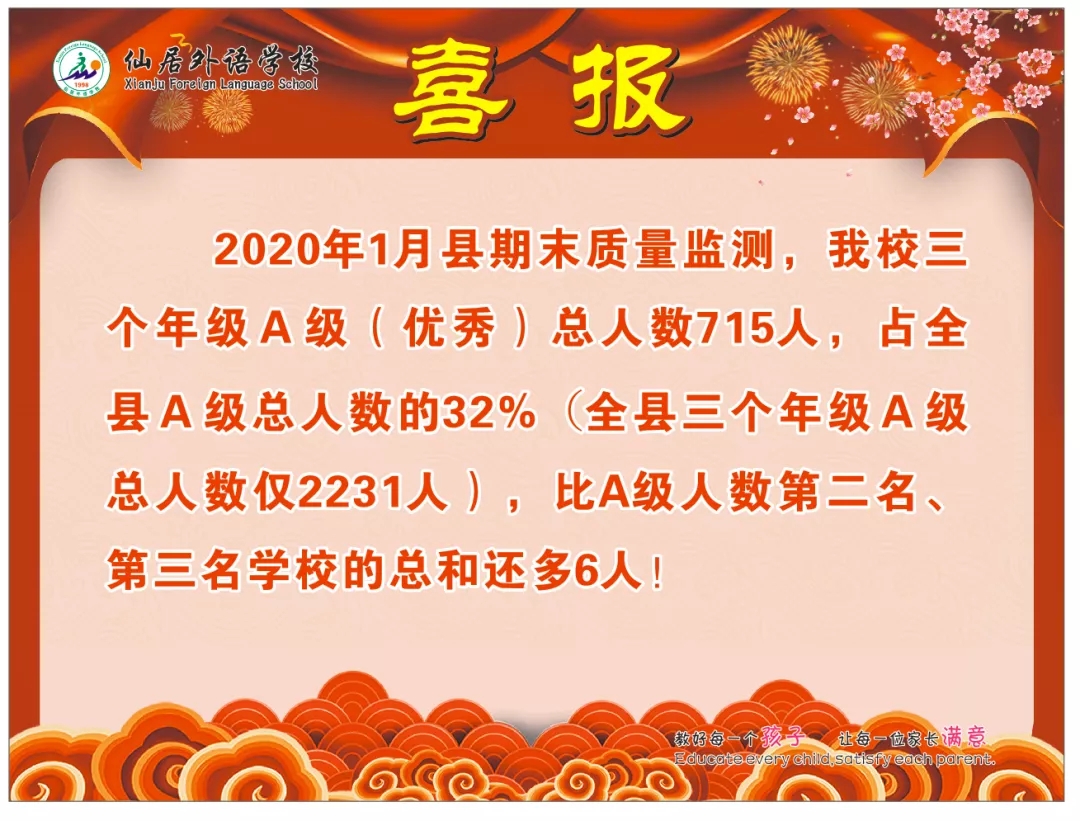 2020年1月仙居縣期末質(zhì)量檢測(cè),我校三個(gè)年級(jí)A級(jí)(優(yōu)秀)總?cè)藬?shù)715人,占全縣A級(jí)總?cè)藬?shù)的32%(全縣三個(gè)年級(jí)A級(jí)總?cè)藬?shù)僅2231人),比A級(jí)人數(shù)第二名、第三名學(xué)校的總和還多6人!