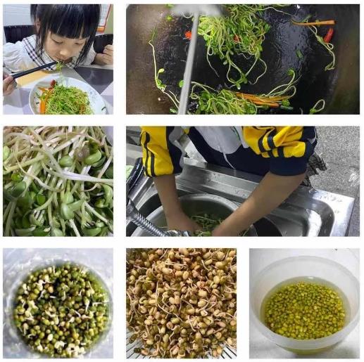 三四年級(jí)的同學(xué)們通過觀看“一粒米的成長(zhǎng)故事”后,再實(shí)踐體驗(yàn),動(dòng)手自發(fā)豆芽,對(duì)豆芽的生長(zhǎng)情況進(jìn)行觀察、記錄,最后做成家常小菜自己品嘗。在活動(dòng)中體驗(yàn)生命的成長(zhǎng)過程,在享受美食的過程中感受食物的來之不易,生發(fā)愛惜之情。