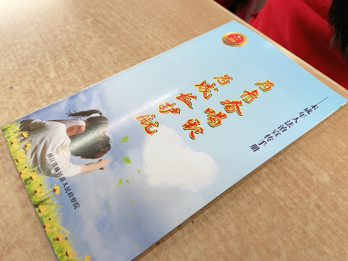 講座前法治宣傳小組人員為同學(xué)們分發(fā)“未成年人法治宣傳手冊”。