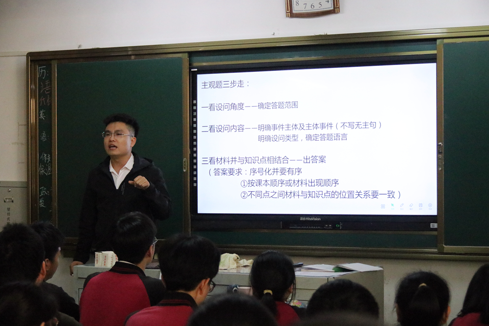 本次教研活動(dòng)分為兩個(gè)環(huán)節(jié):首先,由我校高三優(yōu)秀青年教師韓強(qiáng)老師上“二模試卷講評課”。韓老師從主觀題的答題方法切入,幫助學(xué)生歸納答題技巧和得分方法,從根源上幫助學(xué)生把復(fù)雜的問題簡單化,并通過習(xí)題講解深入復(fù)習(xí)知識(shí)點(diǎn),師生聯(lián)動(dòng),一舉兩得。韓老師憑借扎實(shí)的專業(yè)知識(shí)、自如的課堂調(diào)控、清晰而實(shí)用的授課思路,課堂教學(xué)精煉高效、亮點(diǎn)迭出。