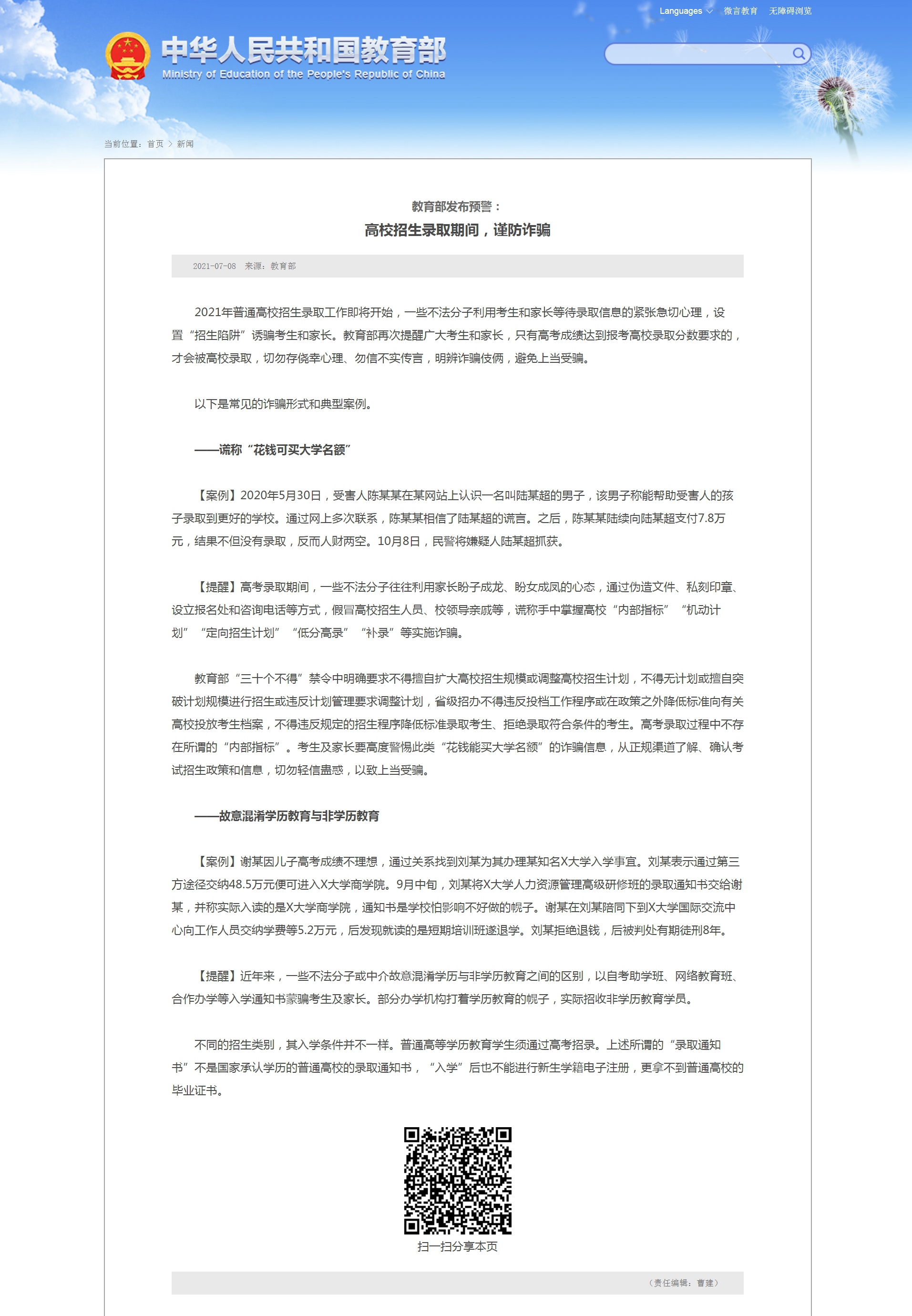 2021年普通高校招生錄取工作即將開始,一些不法分子利用考生和家長等待錄取信息的緊張急切心理,設(shè)置“招生陷阱”誘騙考生和家長。教育部再次提醒廣大考生和家長,只有高考成績達到報考高校錄取分數(shù)要求的,才會被高校錄取,切勿存僥幸心理、勿信不實傳言,明辨詐騙伎倆,避免上當受騙。