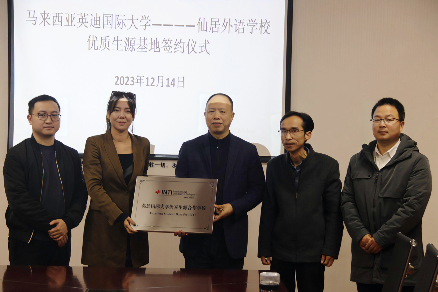 交流結(jié)束后,馬來西亞拉曼理工大學和英迪國際大學代表將“優(yōu)質(zhì)生源基地”牌匾授予我校,雙方與會嘉賓一起合影留念。